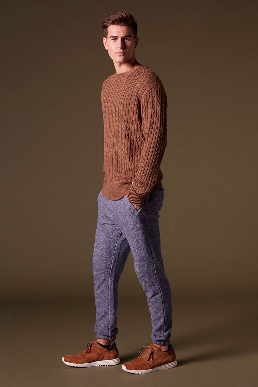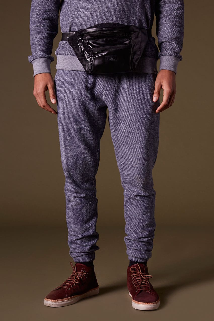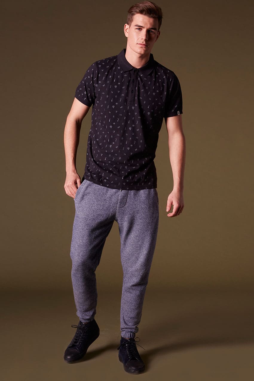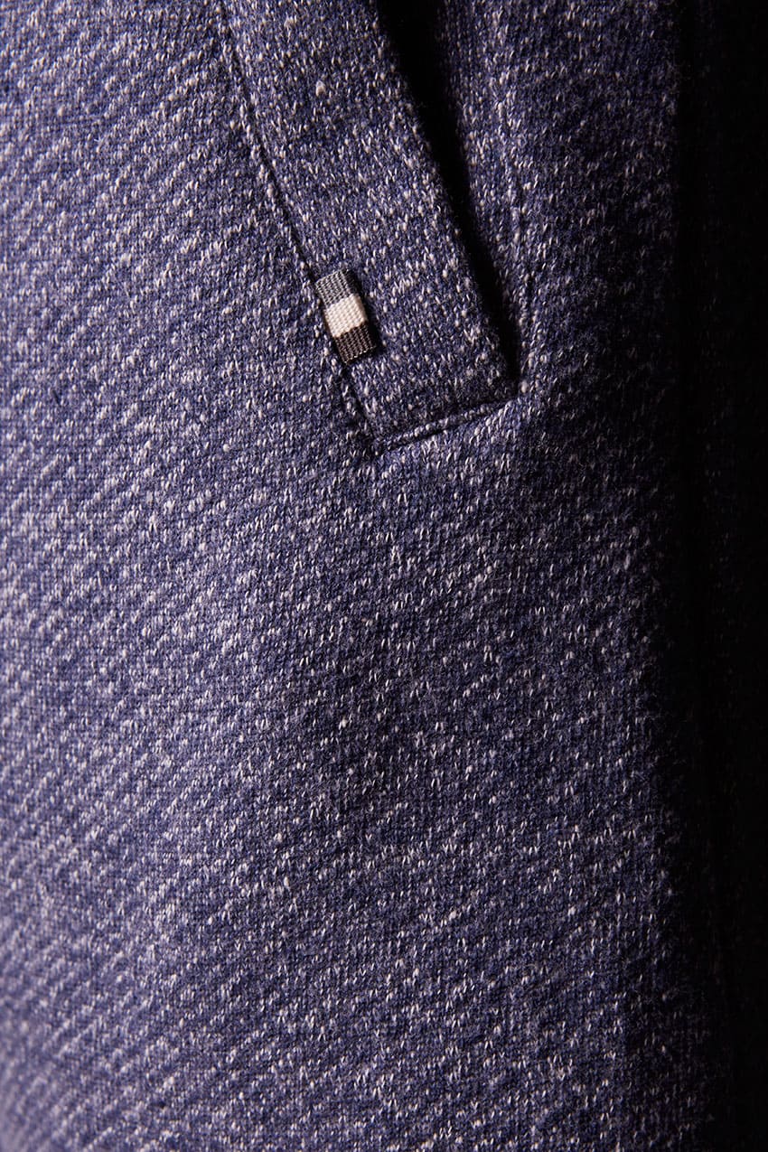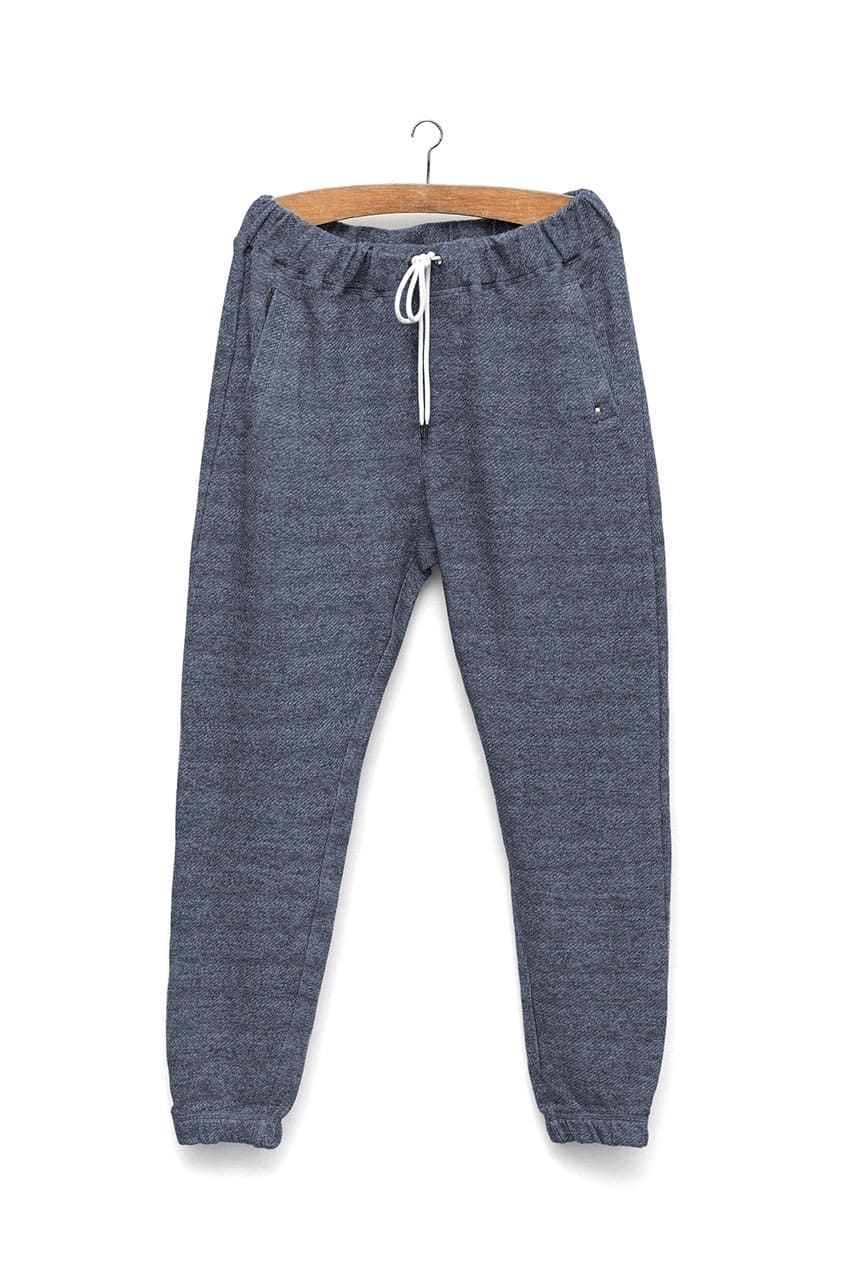 Pantalón Kubota, regular fit, en color dark navy melange y composición 100% algodón felpa sin perchar. Gomas interiores en cinturilla y puño de los bajos. Cierre de cordón redondo en la cintura. Dos bolsillos laterales y bolsillo de ojal en la parte trasera con cierre de velcro. Dibujo de falsa bragueta. Parches decorativos en canvas.