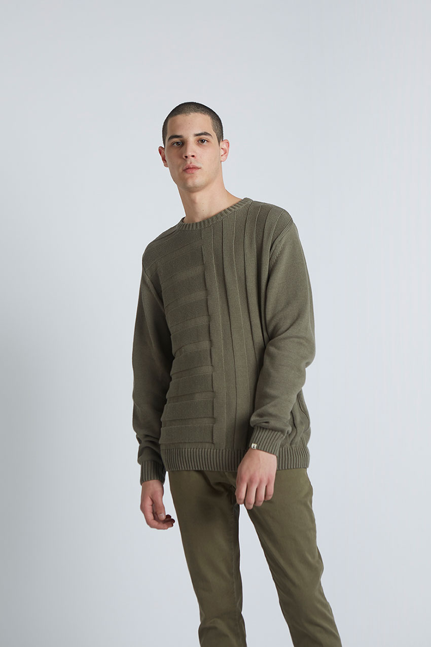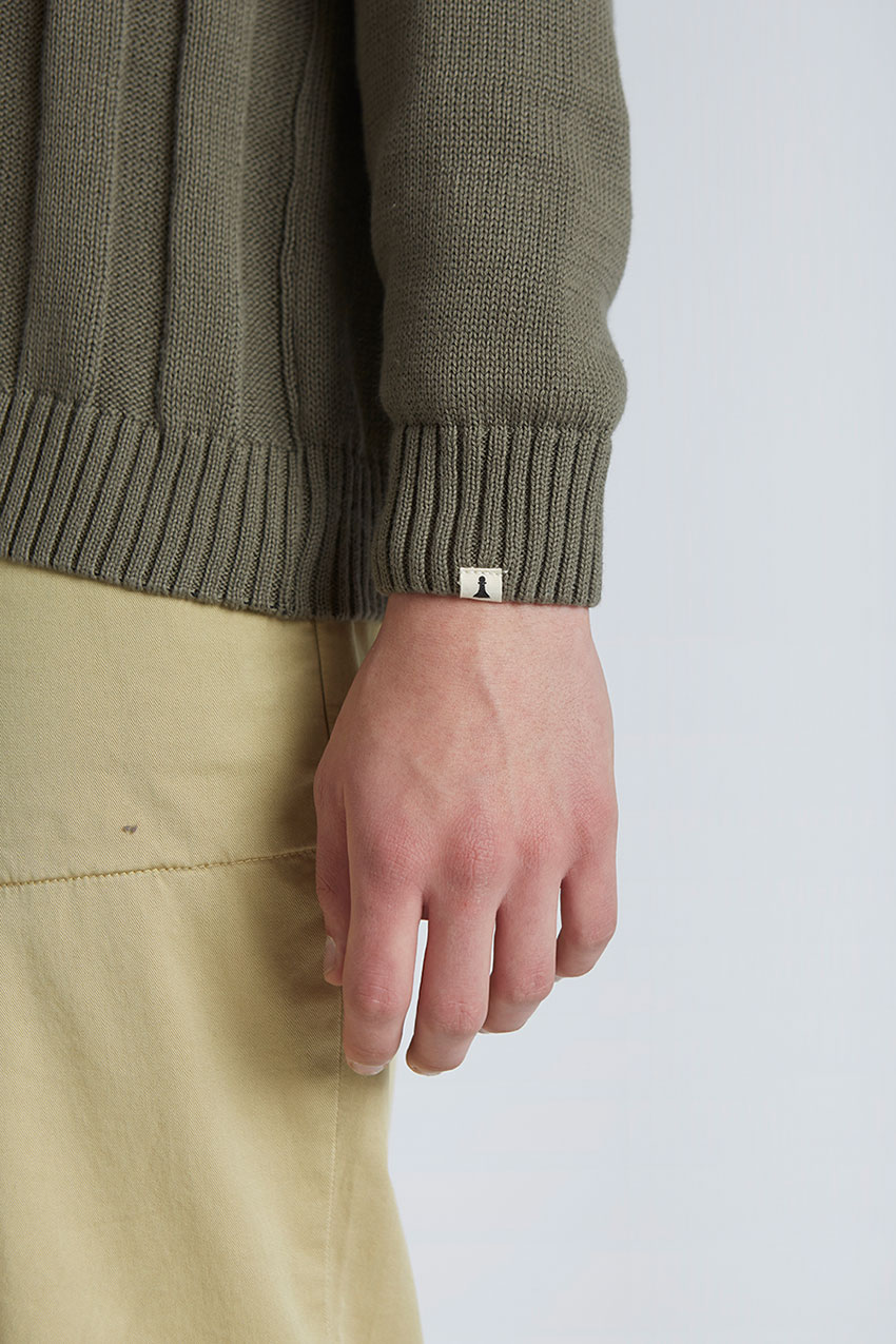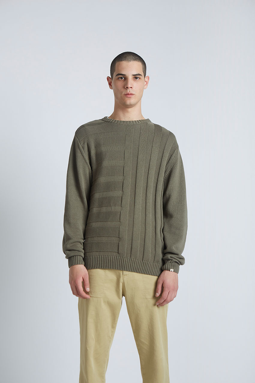 Jersey Twin en color verde oliva y composición 100% algodón 3D knitting, diseñado para la colección otoño-invierno. Un jersey a mitad de camino entre lo formal y lo casual. Corte recto con cuello redondo y logo decorativo en la manga izquierda.