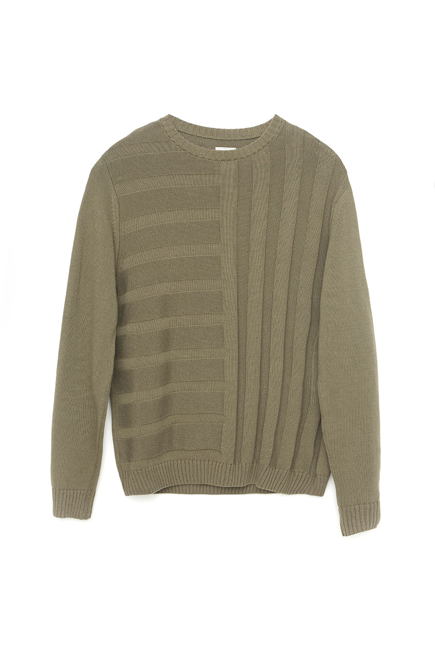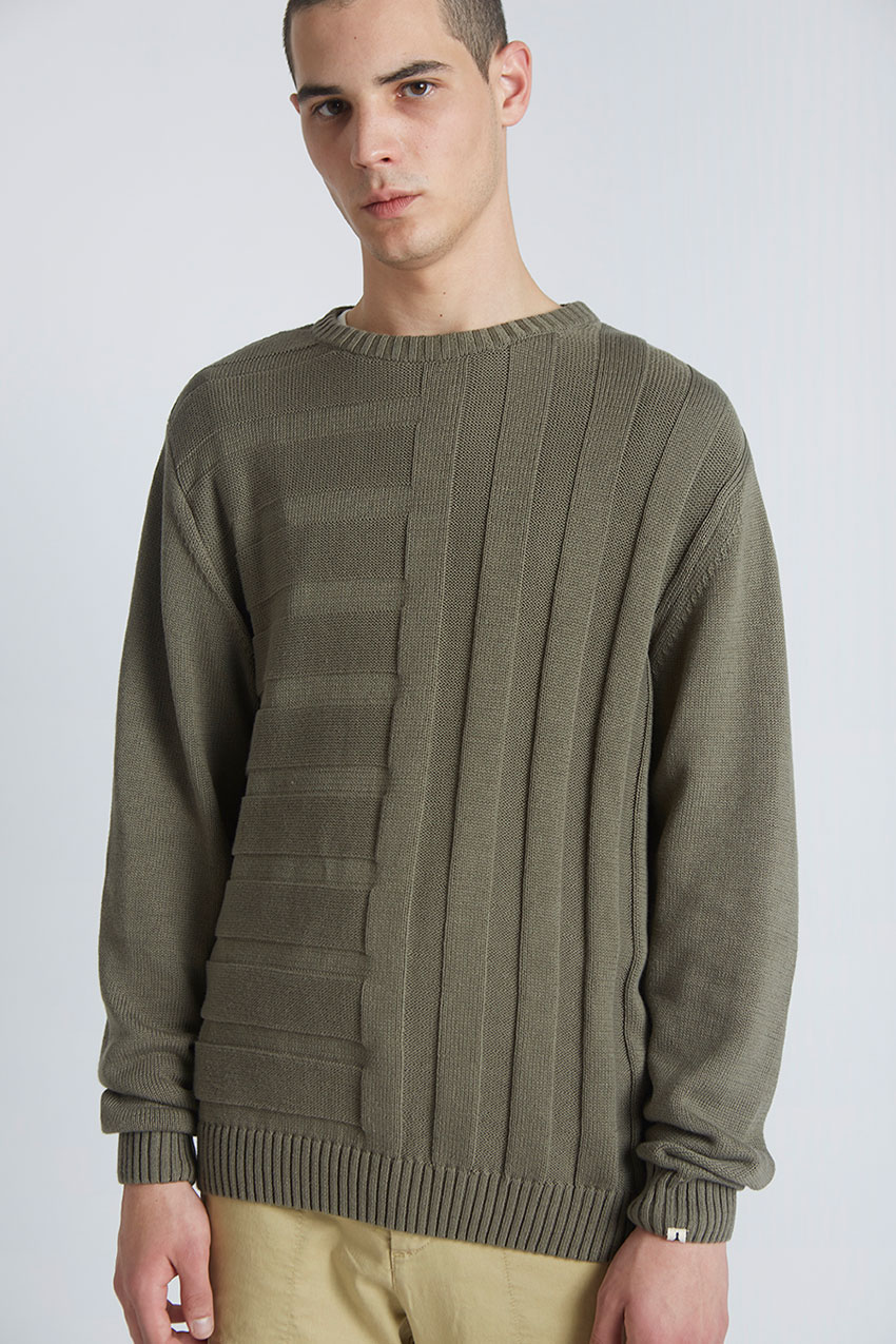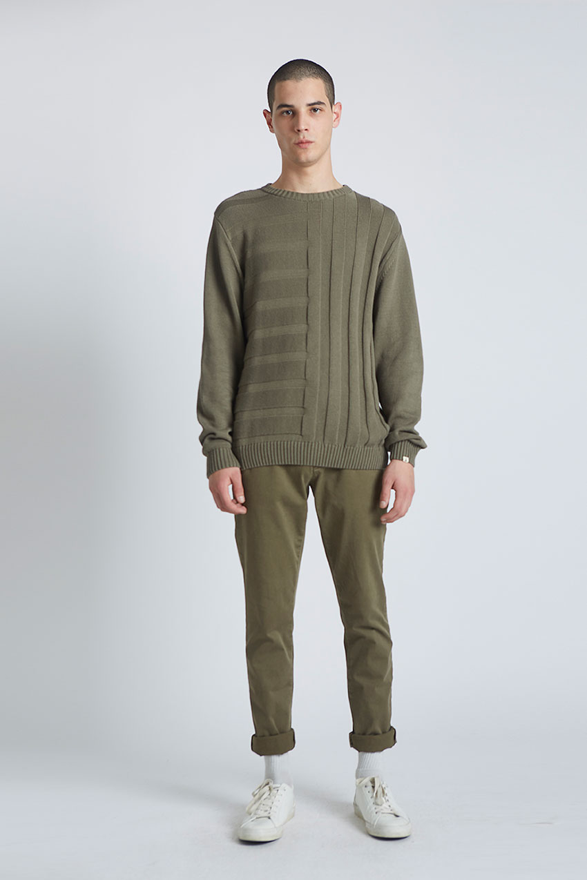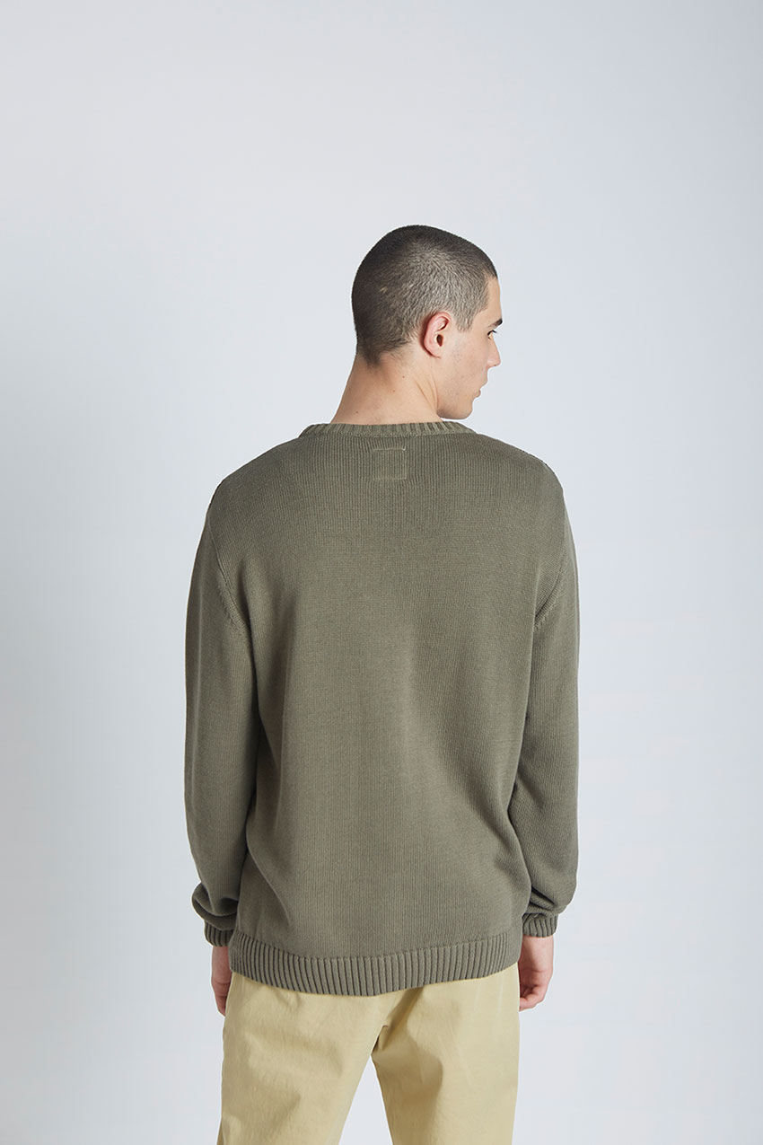 Jersey Twin en color verde oliva y composición 100% algodón 3D knitting, diseñado para la colección otoño-invierno. Un jersey a mitad de camino entre lo formal y lo casual. Corte recto con cuello redondo y logo decorativo en la manga izquierda.